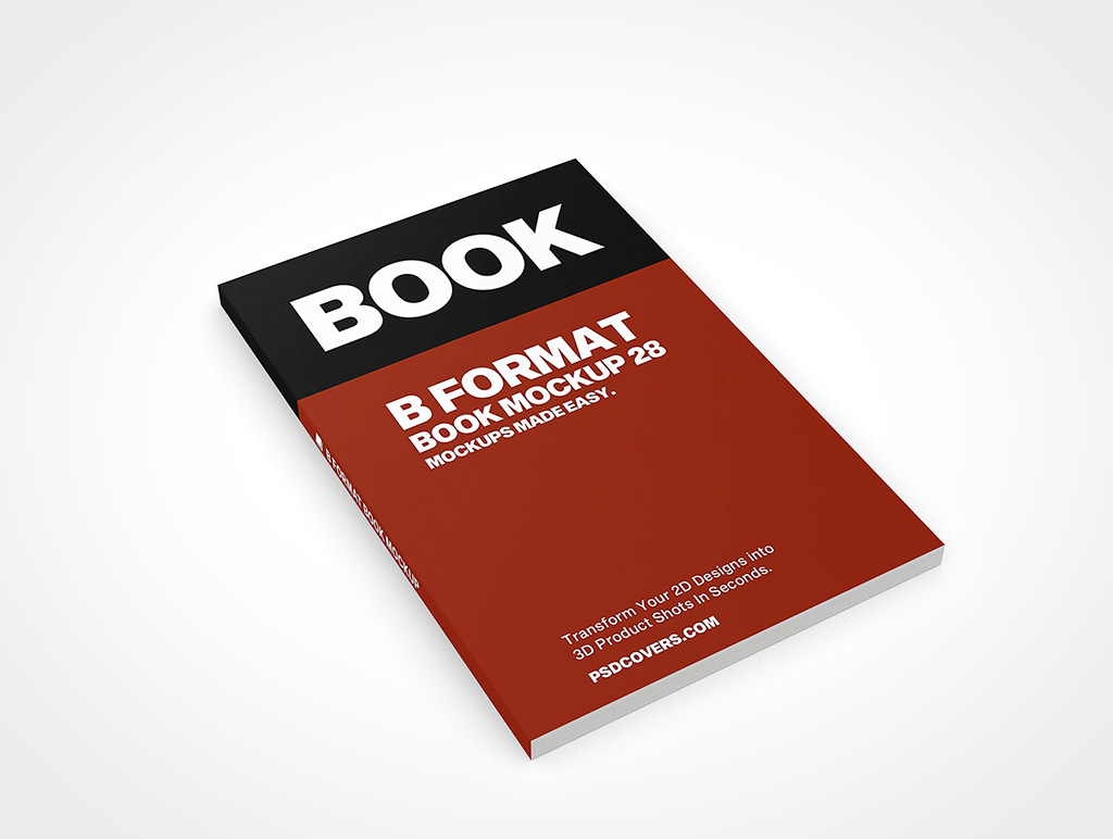 Our B-format book mockup 28 visualizes your softcover artwork while faceup on a flat surface. Measuring 129mm x 198mm (5.1in x 7.8in), this B-format book also features a paperboard cover and perfect binding spine. The length for this B-format book mockup measures 8mm (0.3in) representing a 100-200 page count. Made for personal and commercial use, our high-resolution PSD softcover books are also ideal for visualizing your book cover templates and B-format book designs.