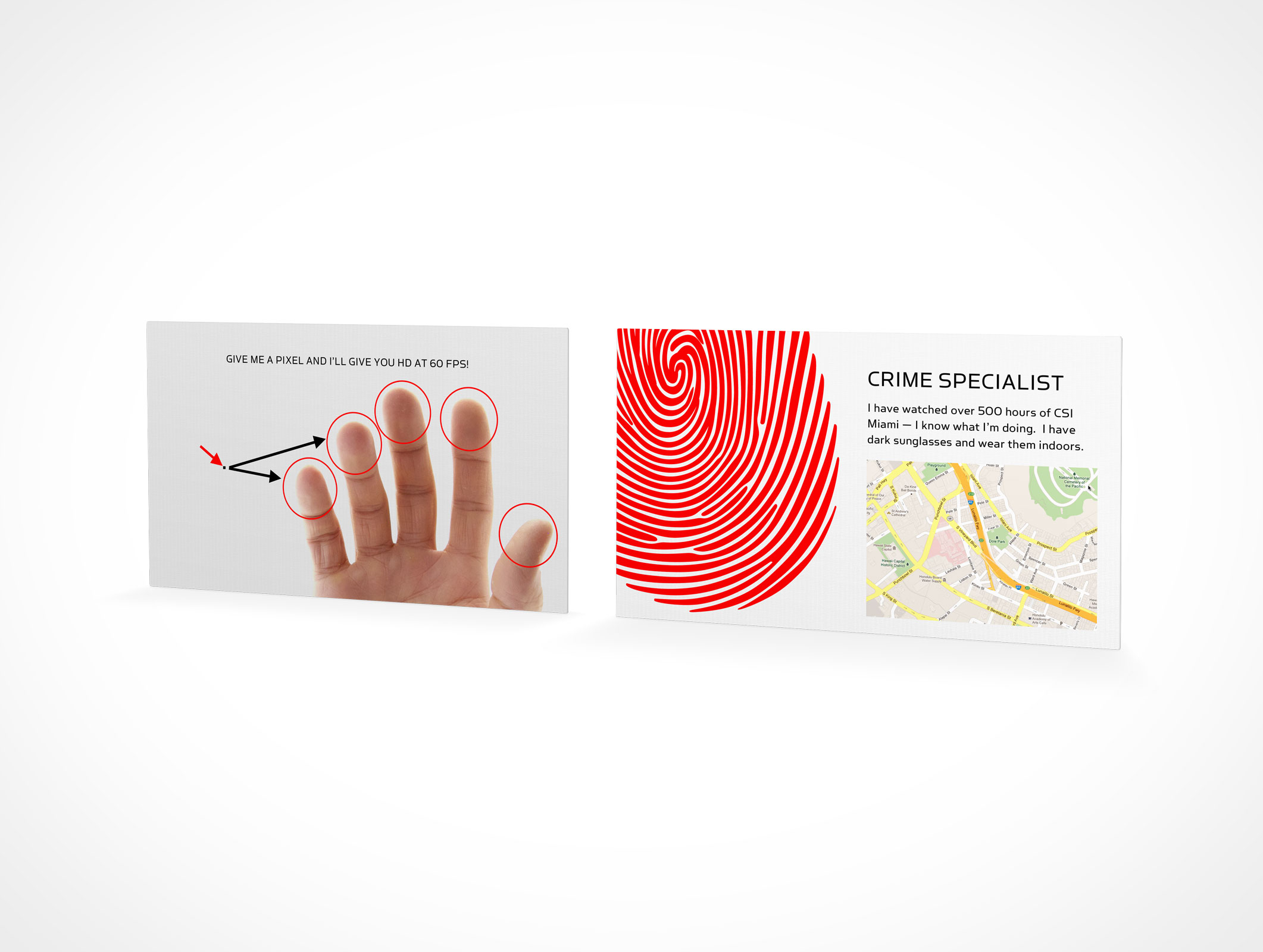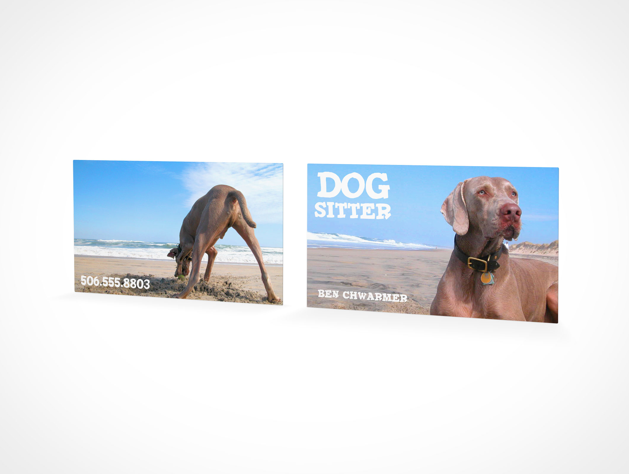 Our business card mockup 5 visualizes two standing cards on a flat surface. Measuring 88mm wide, these business cards simulate 14-point matte cardstock and stand side by side. The width for these business cards measures 51mm and you can render the front or back designs of your card. Made for personal and commercial use, our high-resolution PSD card mockups are ideal for visualizing your a business card template or company card designs.