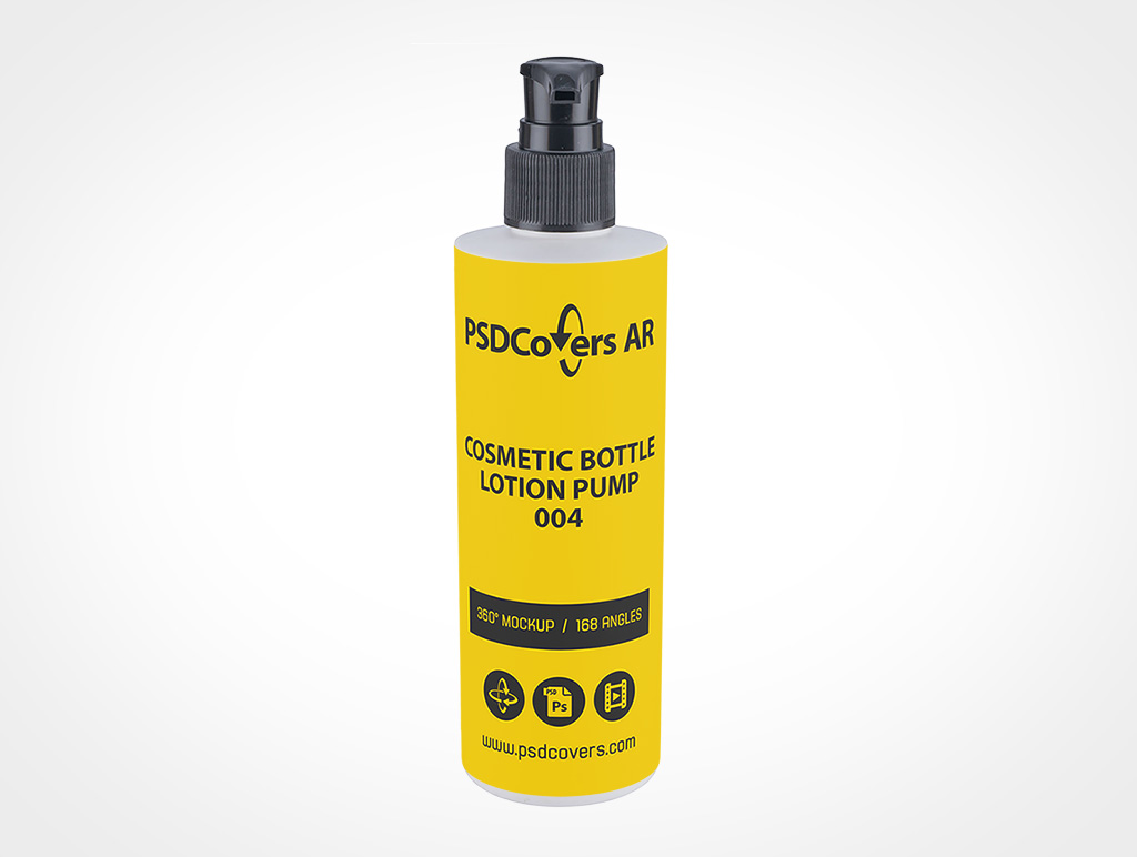 Our cosmetic pump bottle mockup 4 visualizes your HDPE plastic branded cosmetic label design while standing on a flat surface. Measuring 180mm tall, this cosmetic plastic bottle also features a straight sided body with glossy black pump nozzle. The diameter for this bottle mockup measures 52mm with a volume capable of 250mL. Made for personal and commercial use, our high-resolution PSD bottles are also ideal for visualizing your cosmetic templates and branding designs.