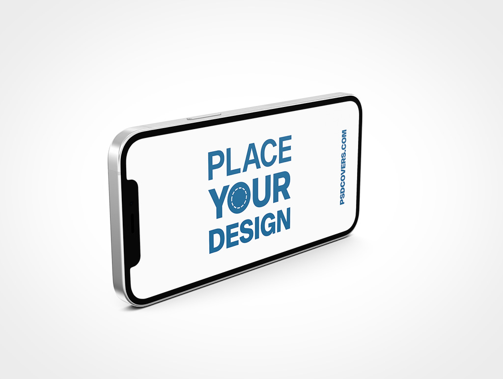 Our iPhone 12 mockup 3 visualizes your app or workflow designs while a landscape position. Measuring 146.7mm tall, this iPhone 12 also features a front camera and notch area. The width for this iPhone 12 mockup measures 71.5mm and has an overall weight of 164g. Made for personal and commercial use, our high-resolution PSD mobile devices are also ideal for visualizing your iPhone templates and onboarding mockup designs.