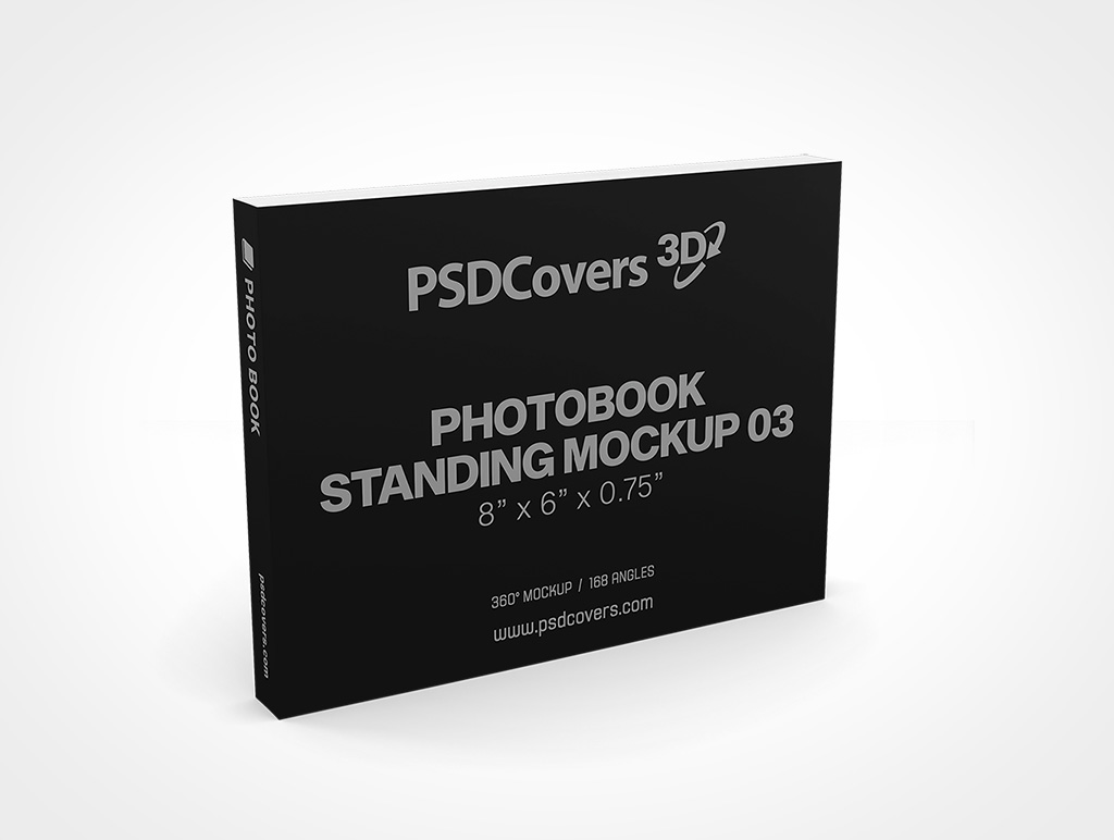 Our book mockup 7819 visualizes your softcover artwork while standing in landscape orientation. Measuring 203mm x 152mm (8in x 6in), this Photo book also features a paperboard cover and perfect binding spine. The length for this book mockup measures 19mm (0.75in) representing a 250-350 page count. Made for personal and commercial use, our high-resolution PSD softcover books are also ideal for visualizing your book cover templates and Photo book designs.