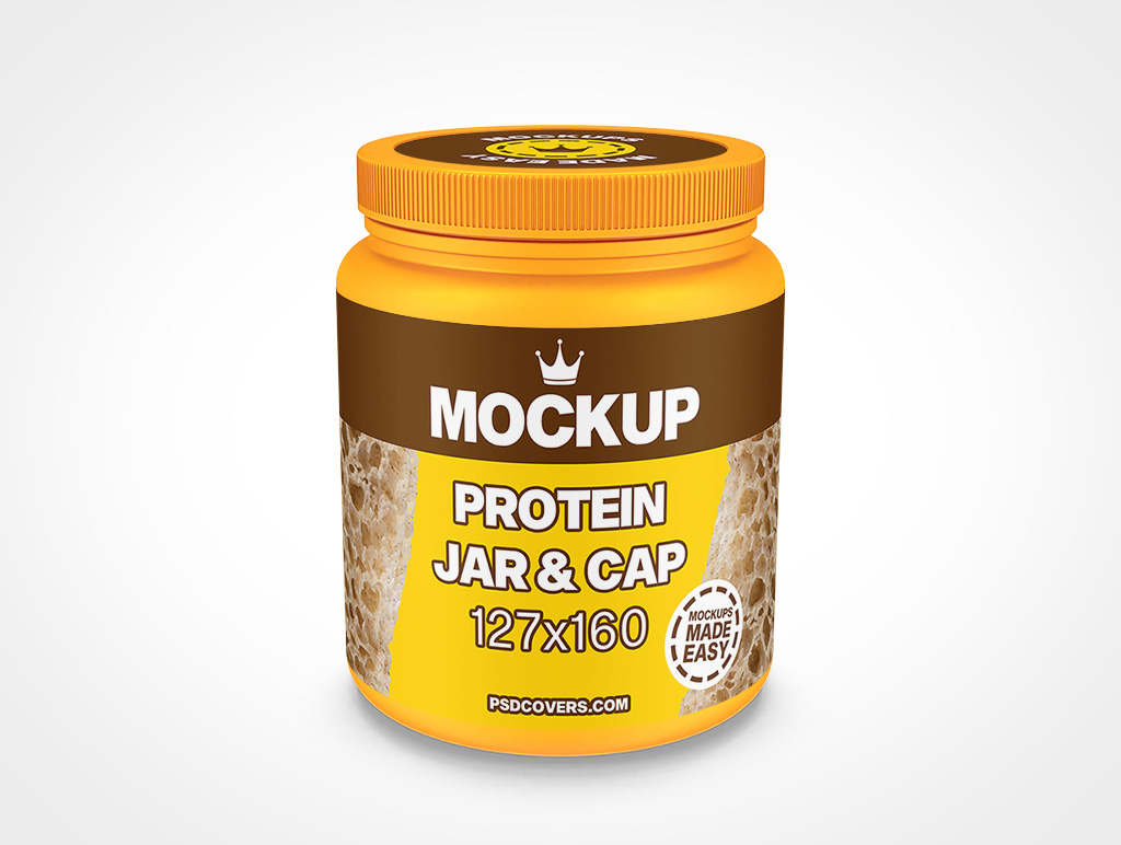 Our protein jar mockup 3 visualizes your whey powder branding while standing on a flat surface. Measuring 160mm tall, this plastic jar also features a rounded base with a wide neck finish and deep skirt lid. The diameter for this protein jar mockup measures 127mm for a total capacity of 1500mL. Made for personal and commercial use, our high-resolution PSD protein jars are also ideal for visualizing your wide mouth jars with deep skirt lids and whey powder plastic jar branding designs.