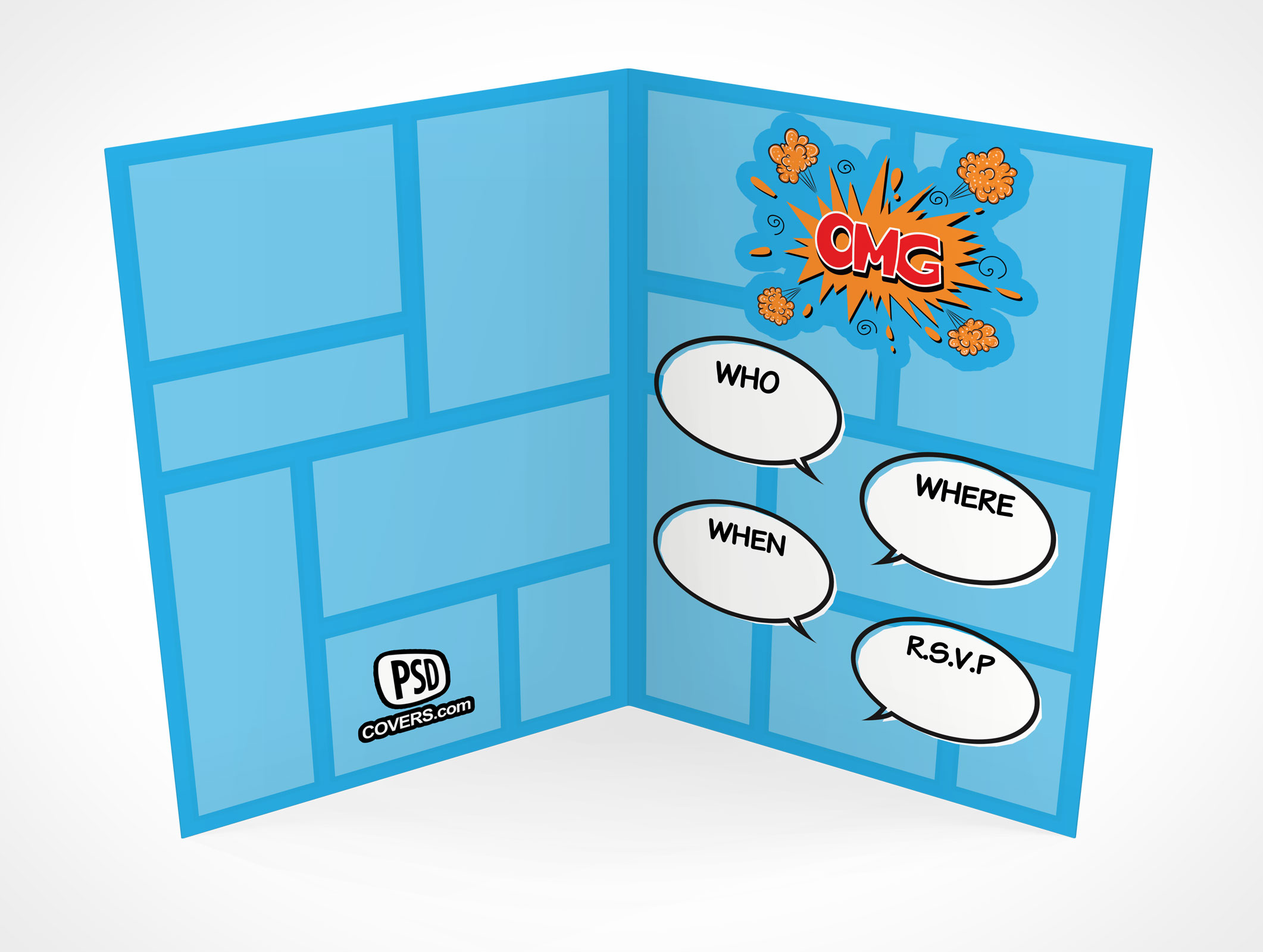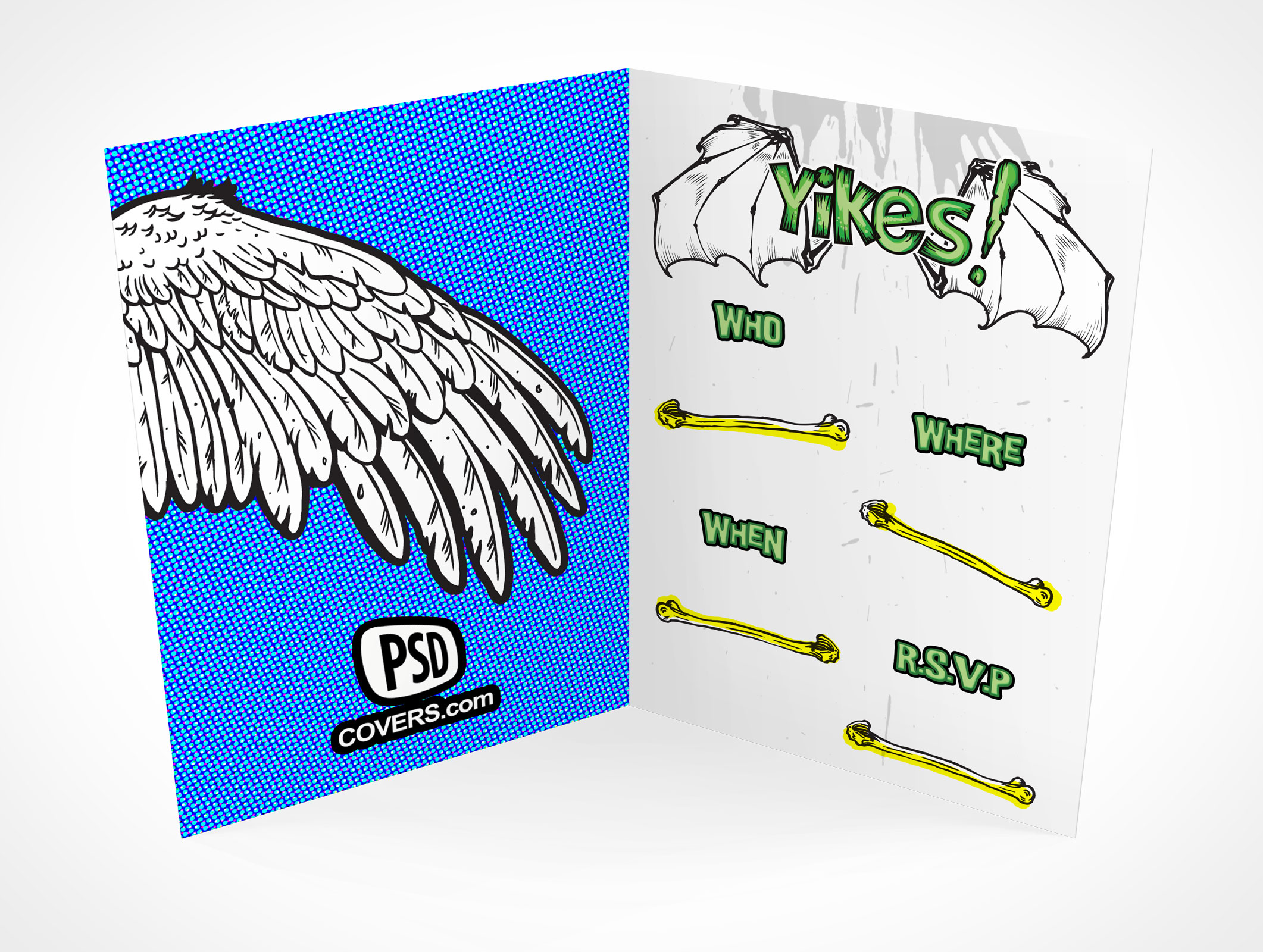 Our bi-fold rsvp card mockup 14 visualizes your invitation card looking down at the inside panels from 30°. Measuring 127mm in height, this rsvp card visualizes your designs on 80lb coated paper stock. The unfolded width for this greeting card measures 180mm and folds to 3.5x5 inches when closed. Made for personal and commercial use, our high-resolution PSD rsvp card mockups are ideal for visualizing your card templates and invitation card designs.