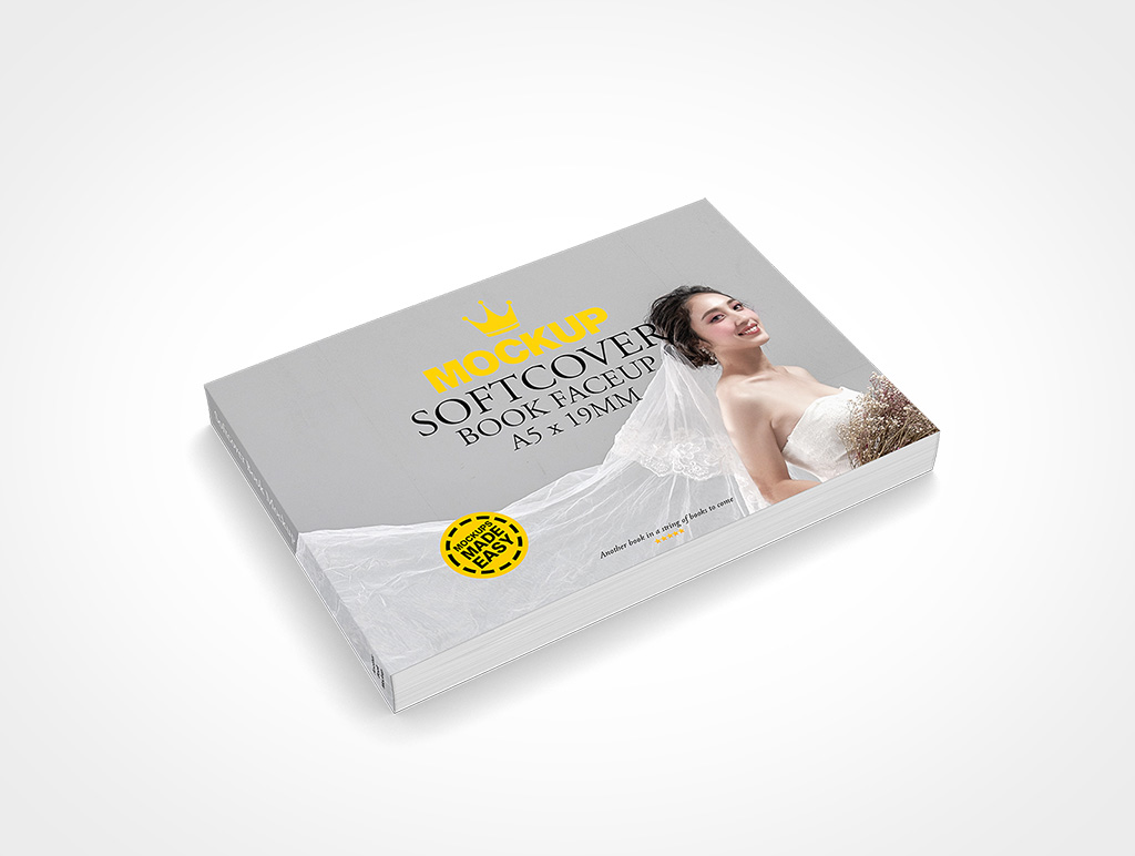 Our A5 landscape book mockup 219 visualizes your softcover artwork while faceup on a flat surface. Measuring 210mm x 148mm (8.3in x 5.8in), this A5 book also features a paperboard cover and perfect binding spine. The length for this cover book mockup measures 19mm (0.75in) representing a 250-350 page count. Made for personal and commercial use, our high-resolution PSD softcover books are also ideal for visualizing your book cover templates and A-format book designs.